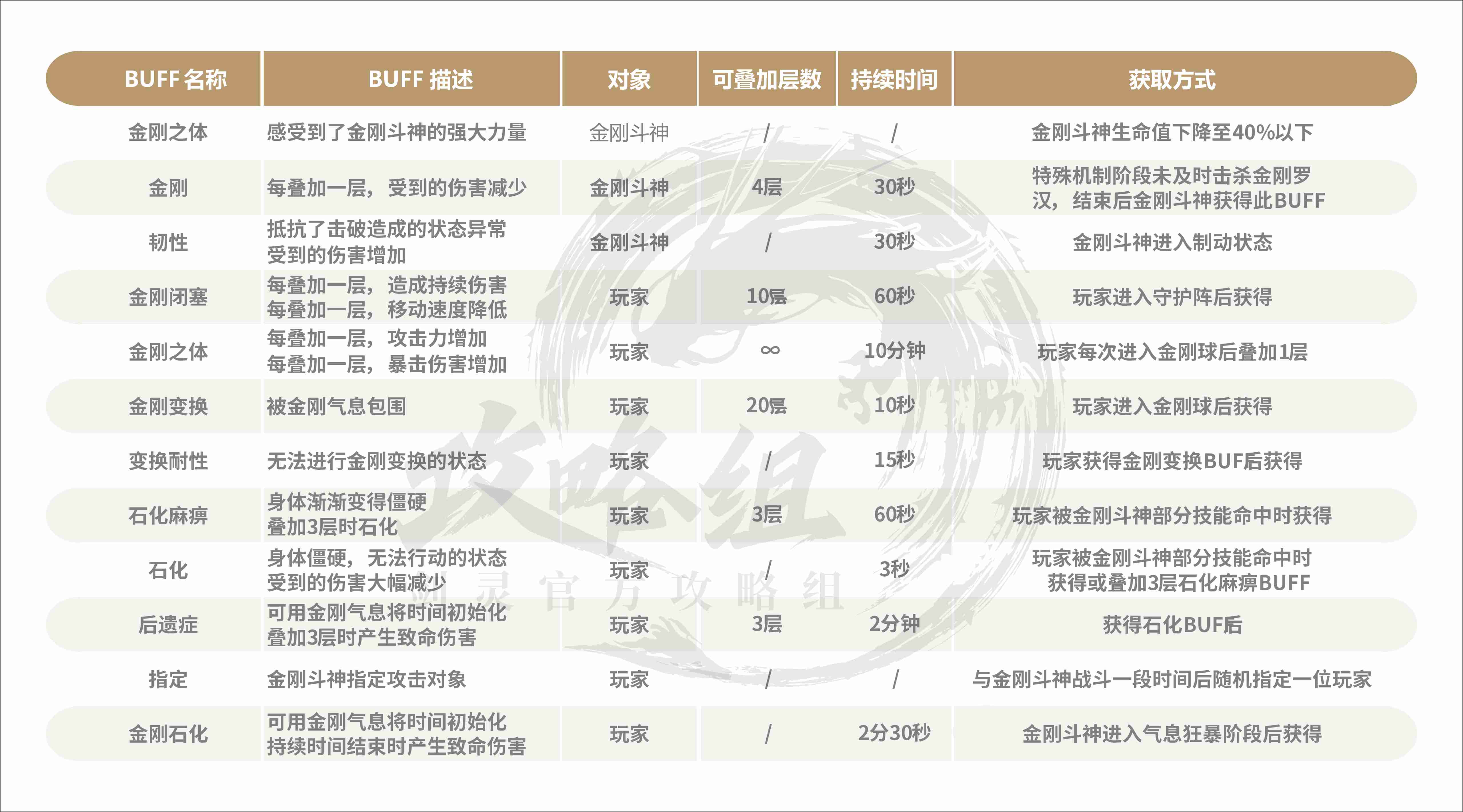 若在金刚斗神施展威压前场上仍有未击杀的金刚罗汉,每1只会给金刚斗神叠加一层持续30秒的“金刚”BUFF。