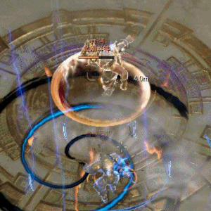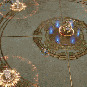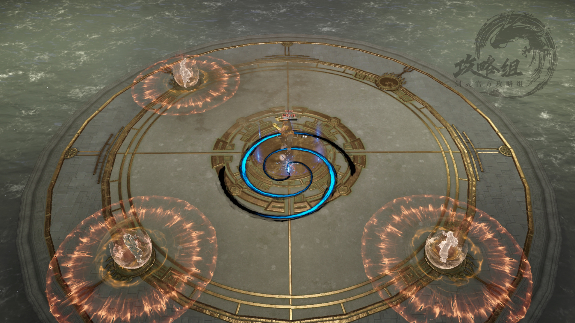 在最开始金刚斗神跳跃回地图中央时,将会召唤4只金刚罗汉在地图边缘,同时在金刚罗汉处生成4个守护阵,如下图所示。