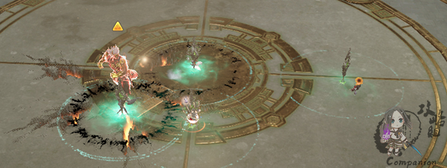 在该阶段金刚斗神跳跃回地图中央时,召唤的金刚罗汉数量会从4只下降至3只,,且有1只金刚罗汉不会被守护阵所束缚,会自行移动,如下图所示。